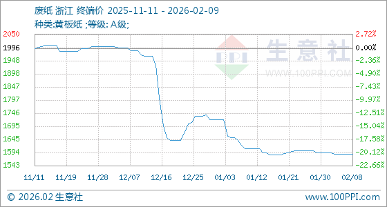 2月9日,生意社废纸基准价为1588.00元/吨,与本月初(1592.00元/吨)相比,下降了0.25%。
